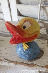 Het is maar de helft van een candycontainer uit Western Germany, maar zo leuk om mee te decoreren.Veer onder het hoofdje, zodat het leuk heen en weer wiebelt.Eend met grote snavel. Hoogte ca 10 cm.