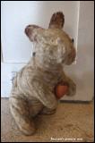 Een mooie candy container, uit het Ertsgebergte.Deze haas is geheel omwikkeld met chenille draad.Het worteltje is van watten.Hoogte, gemeten tot de bovenkant van het oortje is ca 21 cm.De opening, met de koker, zit aan de onderkant
