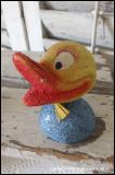 Het is maar de helft van een candycontainer uit Western Germany, maar zo leuk om mee te decoreren.Veer onder het hoofdje, zodat het leuk heen en weer wiebelt.Eend met grote snavel. Hoogte ca 10 cm.